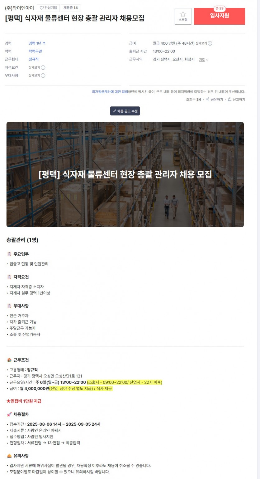 ★공고마감★[정규직] 평택 식자재 물류센터 현장 총괄 관리자 모집/ 석간/ 주 6일/ 13:00~22:00/ 월 400만원/ 잔업, 심야 수당 별도 지급