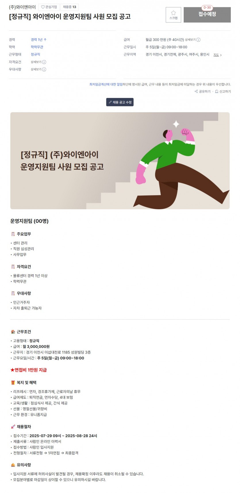 ★공고마감★[정규직] 와이엔아이 운영지원팀 사원 모집/ 주 5일/ 09:00~18:00/ 월 300만원