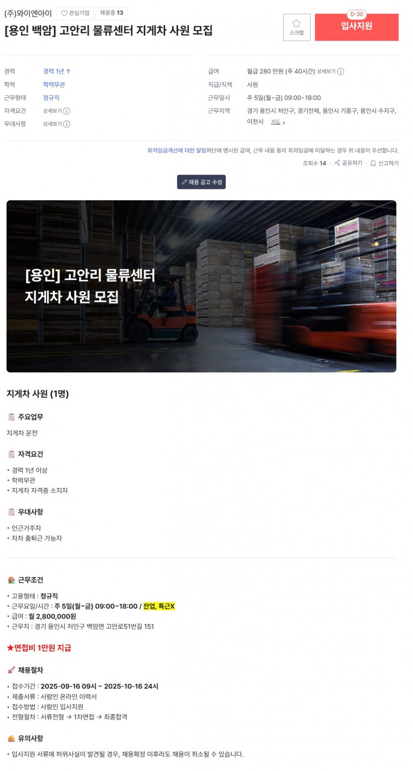 자격 요건 : 물류센터 경력자(1년이상), 지게차 자격증 소지자
