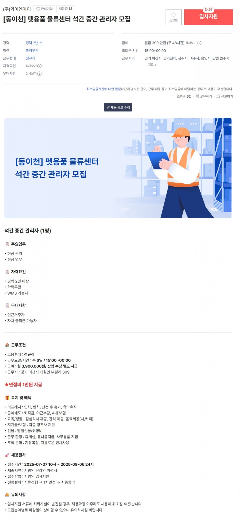 BACK 목록 [정규직]동이천 펫용품 물류센터 석간 중간관리자 모집/ 주 6일/ 15시~00시 25-10-14 15:31 주요 업무 : 현장관리, 현장업무자격 요건 : 물류센터 경력자(2년이상), WMS 가능자우대 사항 : 인근 거주자, 자차출퇴근가능자근무 요일 : 주 6일근무 시간 : 15:00~00:00급여 : 월 3,900,000원지원 방법 : 사람인, 잡코리아, 알바몬 사이트를 통해 온라인 지원감사합니다.