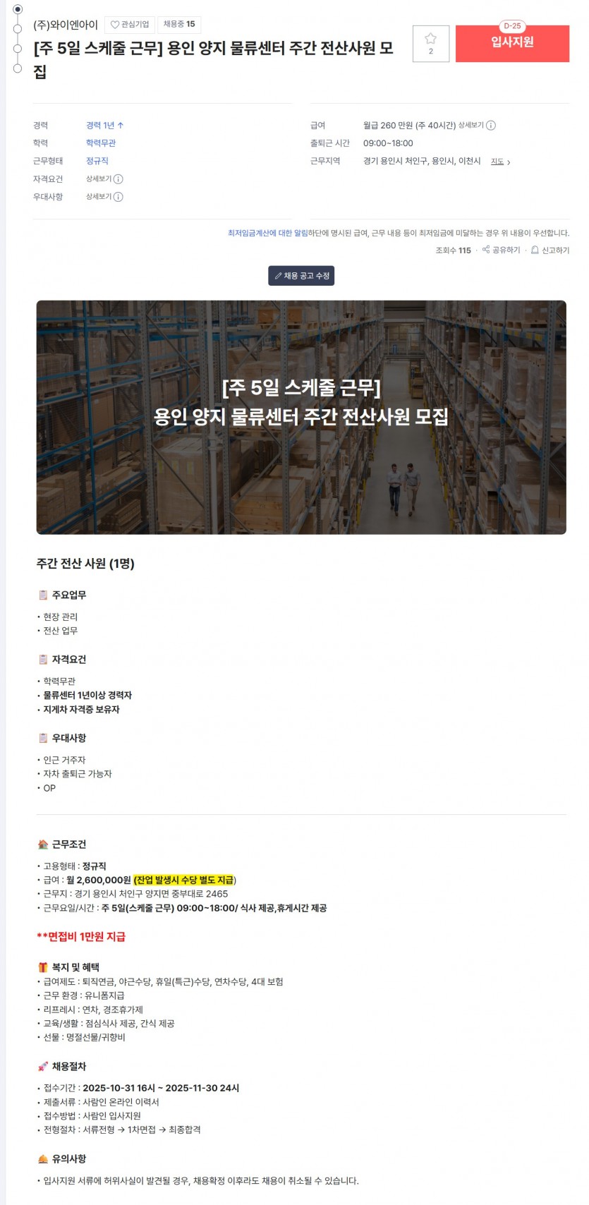 ★공고마감★[정규직] 용인 양지 물류센터 전산사원 모집/ 주간/ 주 5일/ 스케줄 근무/ 09:00~18:00/ 월 260만원