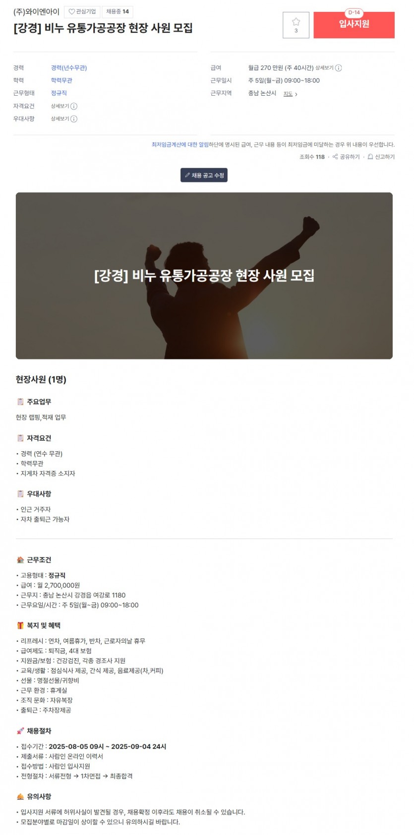 [정규직] 강경 비누 유통가공 공장 현장 사원 모집/ 주간/ 주 5일/ 09:00~18:00/ 월 270만원