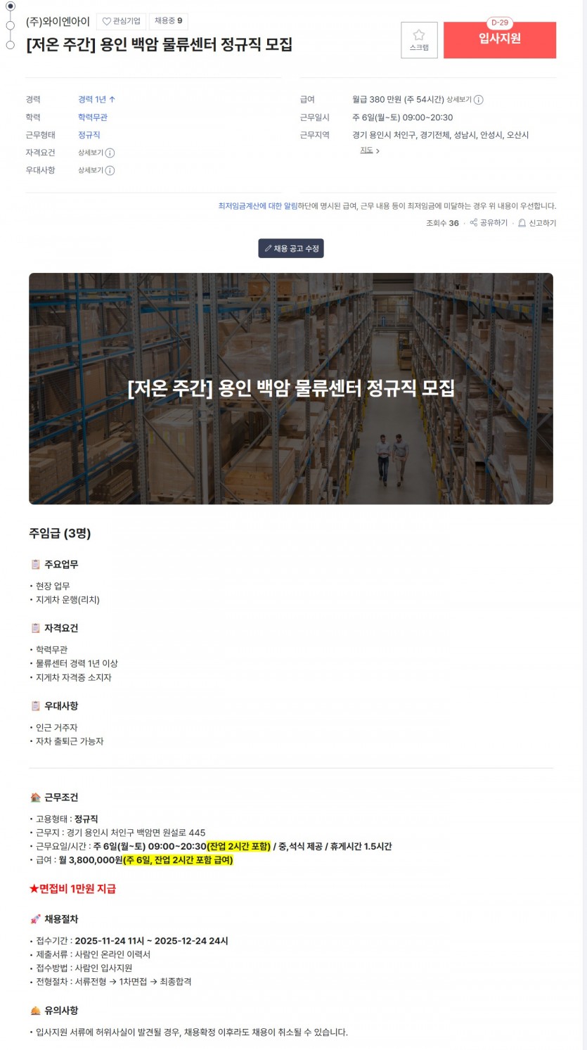 [정규직] 저온 주간 용인 백암 물류센터 정규직 모집/ 주임급/ 주 6일(월~토)/ 09:00~20:30/ 월 380만원